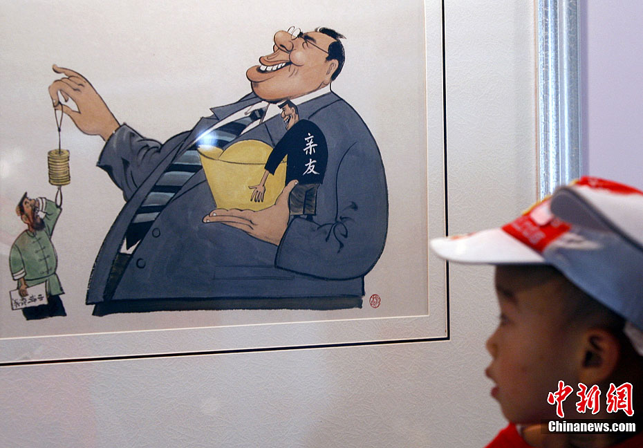 9月5日,一个小男孩儿在中华世纪坛观看一幅名为《亲疏有别》的漫画作品。这里正在举行反腐倡廉艺术作品展,是由北京市纪委、市委宣传部、市文联共同举办的,共展出200件反腐倡廉文艺作品。展览将持续到9月9日,免费向市民开放。中新社发 张浩 摄