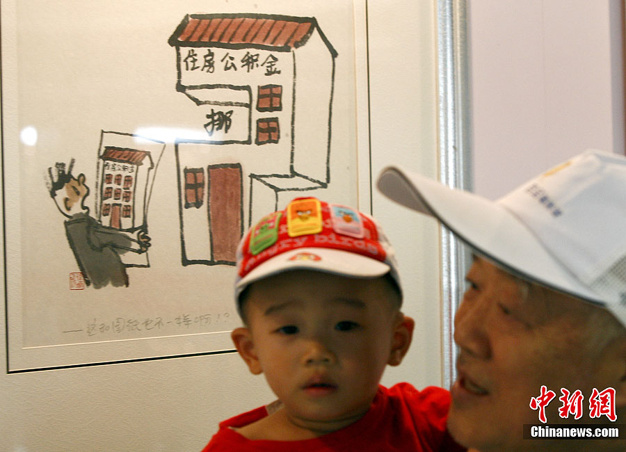 9月5日,一位北京市民带着自己的孙子在中华世纪坛观看一幅名为《这和图纸也不一样呢》的漫画作品。这里正在举行反腐倡廉艺术作品展,是由北京市纪委、市委宣传部、市文联共同举办的,共展出200件反腐倡廉文艺作品。展览将持续到9月9日,免费向市民开放。中新社发 张浩 摄