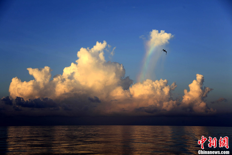 8月20日,中国南海,海天交会云层间出现难得一见的美丽彩虹。当天,中国科学院南海海洋研究所“实验3”号综合科学考察船继续在南海海域开展科考作业。中新社发 孙自法 摄
