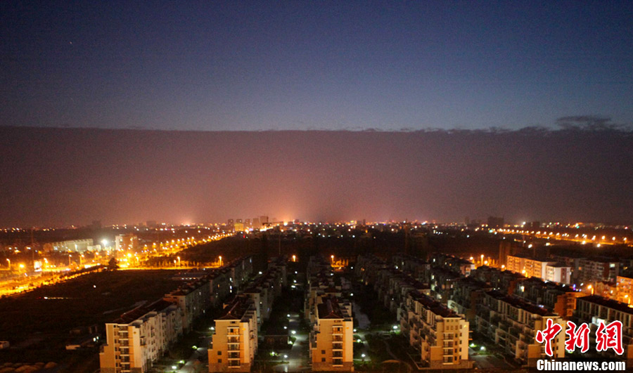 9月1日,在江苏省连云港市赣榆县拍摄的“云墙”天象。当晚,赣榆县出现“云墙”天象,持续时间近50分钟,“云墙”分界十分清晰。据当地气象专家介绍,该现象是冷暖空气峰面交汇而致。中新社发 司伟 摄图片来源:CNSPHOTO