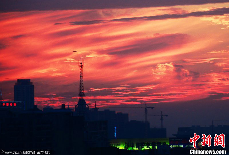 8月23日,农历“七夕”,傍晚7时左右,江城武汉天空出现难得一见的火烧云晚霞。周国强 摄 图片来源:CFP视觉中国