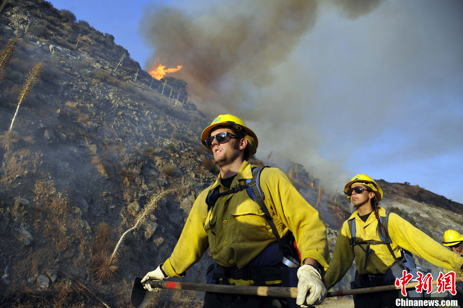 当地时间9月4日,800名消防人员投入洛杉矶圣盖博峡谷,对正在燃烧的森林火灾进行施救。据当地林务局公布的数据显示,这场始于9月2日下午的火灾已烧毁近3700亩森林,目前局部火势得到控制。中新社发 毛建军 摄