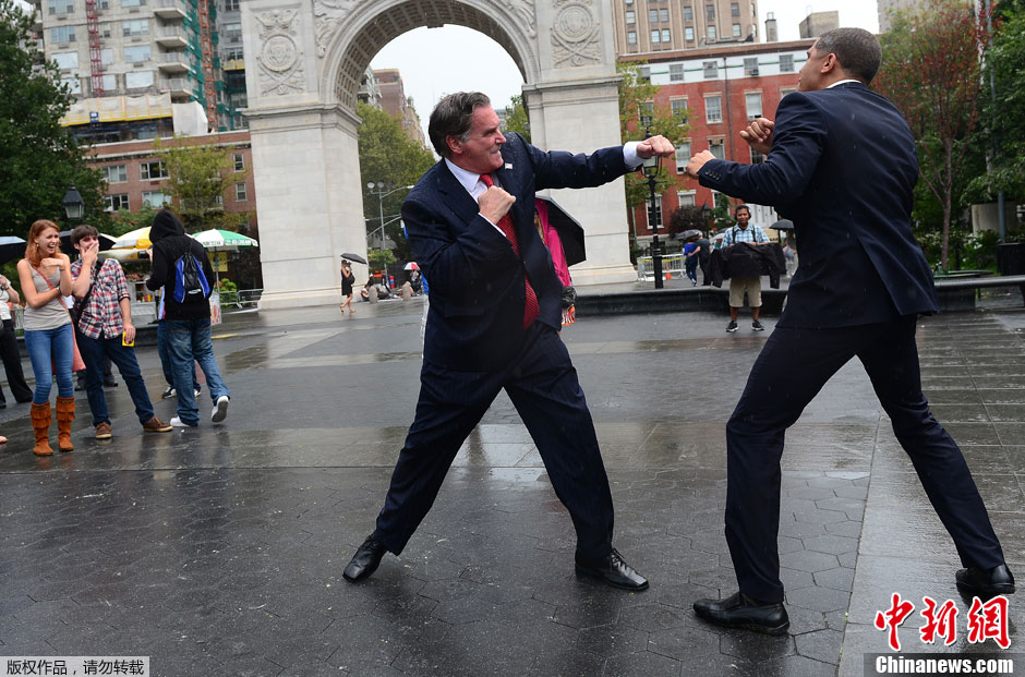 当地时间9月5日,美国纽约华盛顿广场公园,现任美国总统“奥巴马”模仿者Reggie Brown和美国总统候选人“罗姆尼”模仿者Mike Cote一较高下,上演一场“终极对决”。