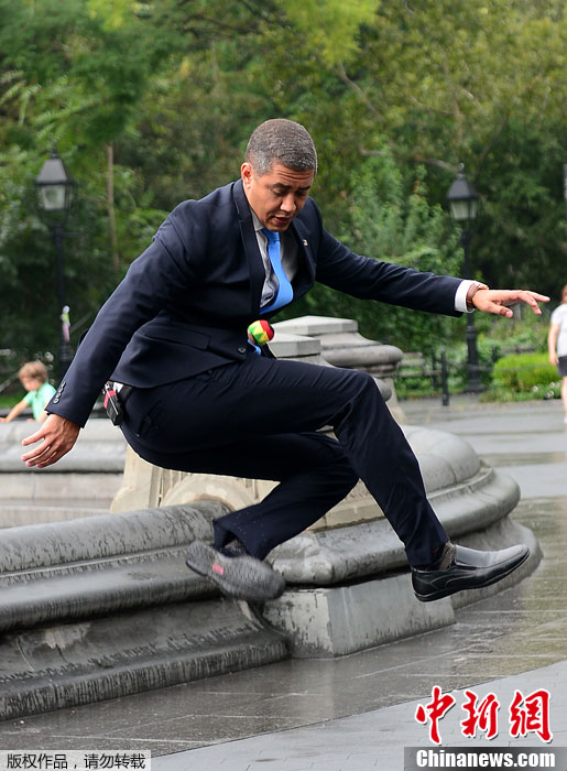 当地时间9月5日,美国纽约华盛顿广场公园,现任美国总统“奥巴马”模仿者Reggie Brown和美国总统候选人“罗姆尼”模仿者Mike Cote一较高下,上演一场“终极对决”。