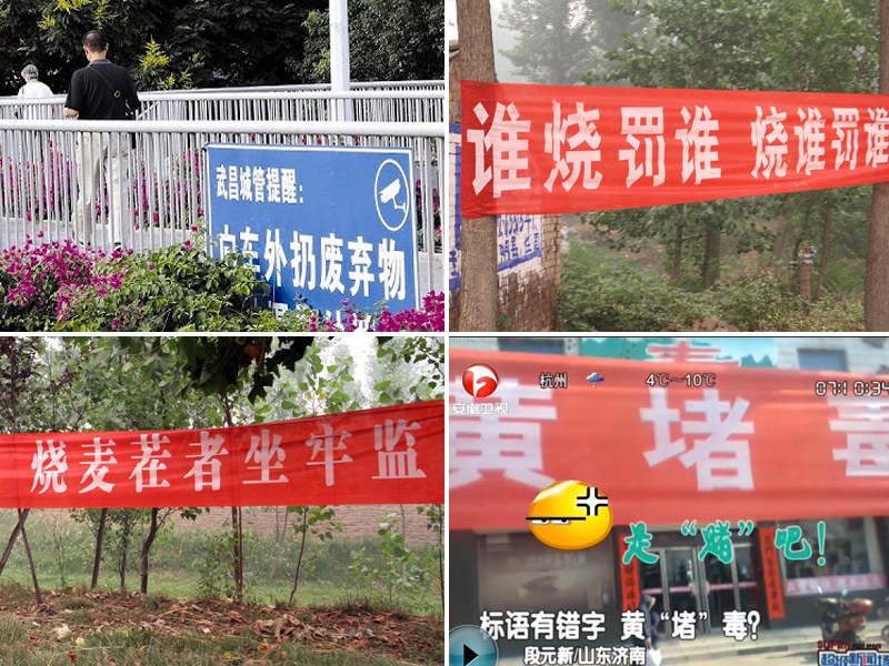 右上、左下:2012年6月14日,在河南省商丘市到永城市的公路两侧出现“谁烧罚谁,烧谁罚谁”“一粒粮食一滴汗,烧麦茬者坐牢监”等宣传语。