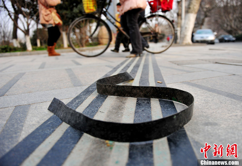 黑胶带贴出盲道:2011年3月4日,南京市鼓楼区绿地广场鼓扬线车站附近的盲道出现了异样,盲道应该是凹凸不平的,盲人走在上面才能有感觉,但绿地广场附近的这处盲道很奇怪,是五条黑色的胶布贴在地面上,以前胶布和地面贴得紧的时候看不出来,可现在,黑色胶布已经粘不住了,有些翘起这才露馅。