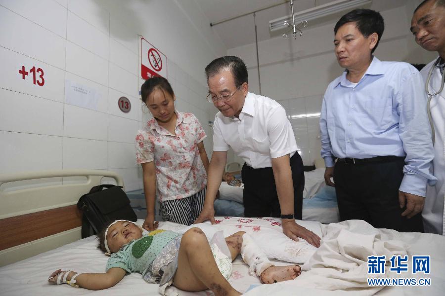 9月8日凌晨,中共中央政治局常委、国务院总理温家宝抵达云南昭通地震灾区,指导抗震救灾工作。这是温家宝在彝良县人民医院看望受伤儿童。新华社记者丁林摄 图片来源:新华网