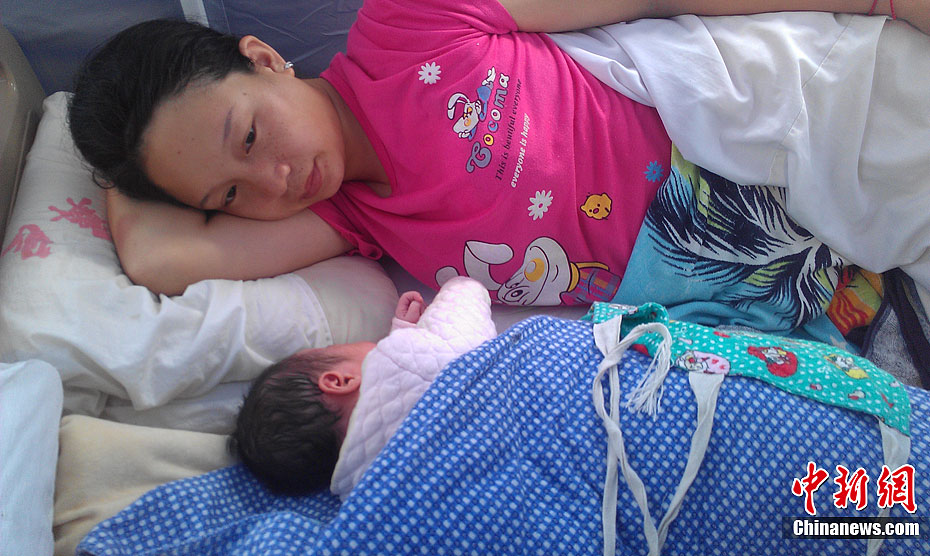 9月8日清晨,云南省彝良县人民医院,这里是此次地震的灾民安置点之一。图为8日凌晨在帐篷中出生的婴儿躺在母亲身边。中新社发 顾一行 摄