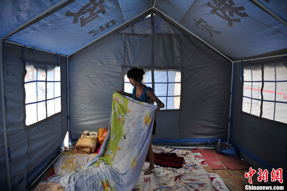 9月8日清晨,云南彝良地震震中所在地洛泽河镇。该镇毛坪中学是此次地震灾区一个重要的民众安置点。洛泽河镇政府称,9月7日中午发生的地震已经造成该镇49人遇难。图为正在帐篷里叠被子的民众。刘冉阳 摄