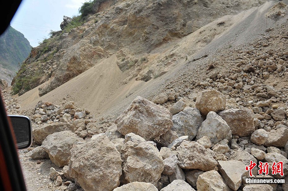 9月8日,云南彝良地震震中洛泽河镇附近道路上,不断发生的余震引发山体落石。截止8日早上8时,云南彝良地震灾区发生余震161次,最大余震4.4级。刘冉阳 摄