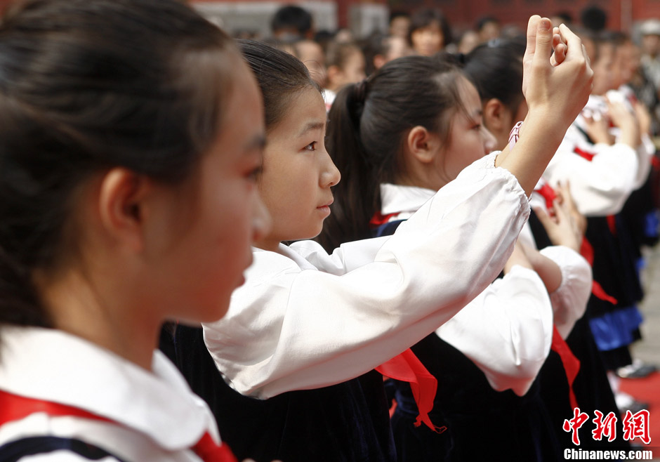 9月9日,在北京孔庙大成殿广场,120余名小学生用古礼祭拜先师孔子,纪念教师节的到来。“第三届北京孔庙国子监国学文化节”也就此拉开帷幕,而该文化节的闭幕式则将在孔子诞辰之日9月28日举行。中新社发 张浩 摄