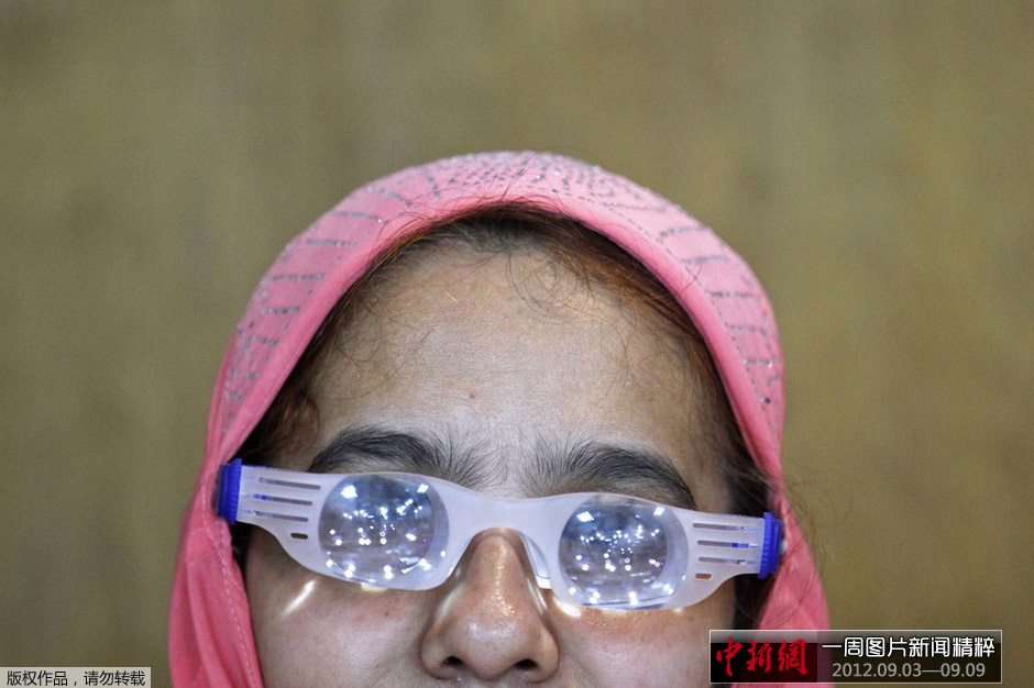 周三,在孟加拉国达卡举行的一个残疾人信息及通讯设备展上,一名视力受损的女子试戴具有放大作用的眼镜。
