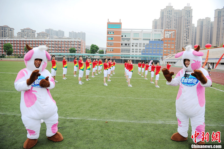 9月9日,近5000名产业工人来到长沙贺龙体校参加工间操展演比赛。工人们创编各自特色工间操同场竞技,以这种独特的方式来解除平日中的工作压力。长沙经开区总工会负责人表示,今年将全面推行工间操与职工锻炼相结合,通过推进工间操活动的开展,在全区范围内掀起全员健身的热潮。图为企业用“奶牛”助威。杨华峰 摄