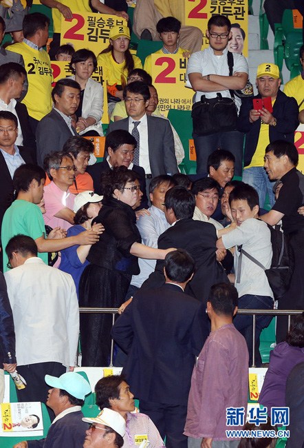 当地时间2012年9月9日,韩国民主统合党在18届总统候选人选拔活动在大田忠武体育馆举行,相关候选人均到场。在该党代表李海瓒发表致辞时,一位候选人的支持者和工作人员发生身体冲突。各位候选人的支持者还在会议期间,向场内投掷鸡蛋、水瓶等。图片来源:新华网