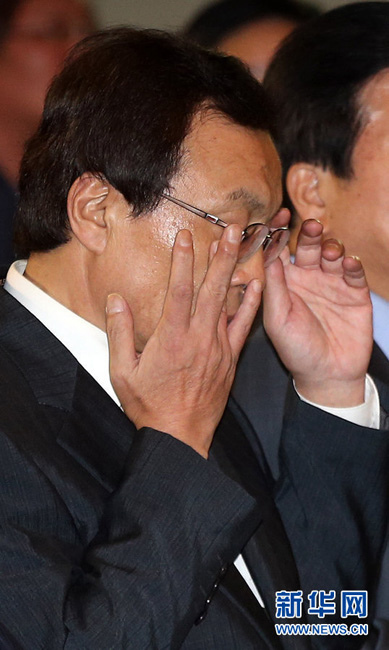 当地时间2012年9月9日,韩国民主统合党在18届总统候选人选拔活动在大田忠武体育馆举行,相关候选人均到场。在该党代表李海瓒发表致辞时,一位候选人的支持者和工作人员发生身体冲突。各位候选人的支持者还在会议期间,向场内投掷鸡蛋、水瓶等。图片来源:新华网