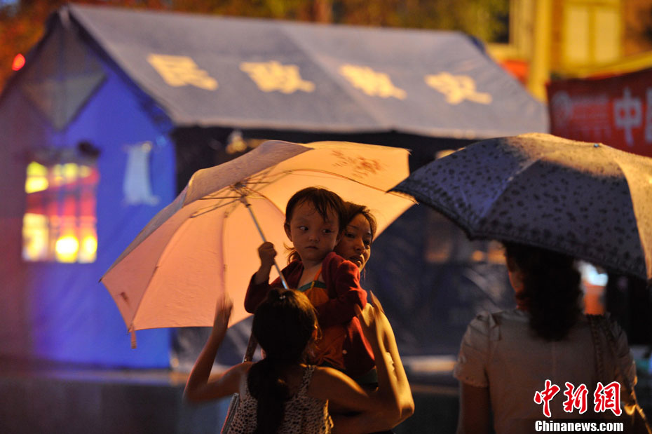 9月10日晚,彝良县城开始降雨。据昭通市气象台10日16时发布天气预报显示,彝良地震灾区今天夜间到明天白天阴有大雨,局部暴雨。需防范滑坡、泥石流等次生灾害发生。中新社发 刘冉阳 摄