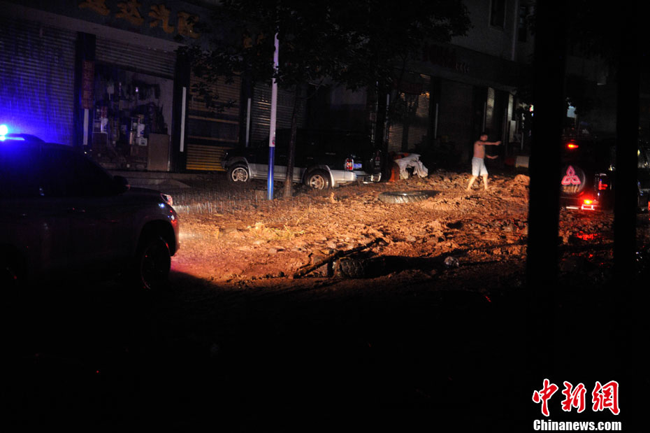9月11日凌晨,云南彝良地震灾区的降雨增大至暴雨量级,全县发布暴雨红色预警,雨水、山洪不断蔓延至路面。图为被灌满泥浆的道路。中新社发 刘冉阳 摄