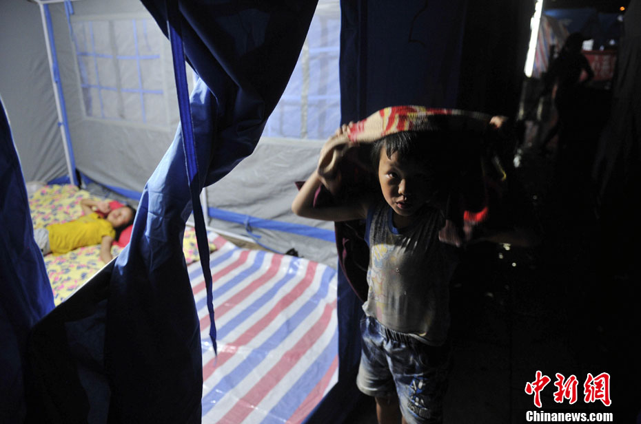 9月10日晚,云南省昭通市彝良县地震灾区开始降雨,在彝良县城最大灾民安置点内,没有铺塑胶垫的帐篷进水。昭通市气象台10日23时50分发布暴雨蓝色预警信号,预计未来12小时,全市有大雨、局部暴雨。需做好强降水引发的山洪、滑坡、泥石流等灾害防御。其中地震灾区要特别注意防范。中新社发 刘冉阳 摄