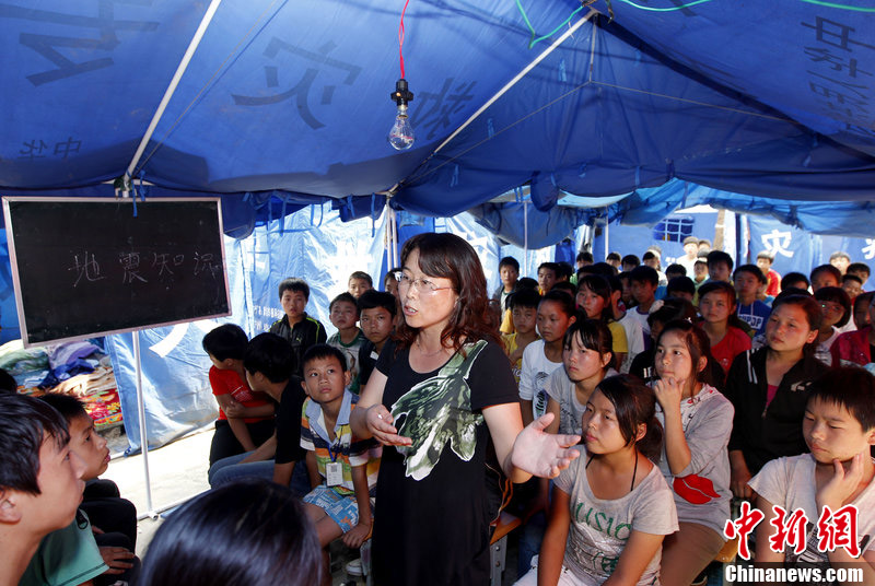 2012年9月10日,当日是教师节,云南省昭通市彝良县地震灾区的实验小学、民族中学、角奎中学、示范小学等“帐篷学校”开课。老师们特别开设了音乐、美术、心理辅导等课程,以抚慰灾区孩子们的心灵。图为在彝良县民族中学,414名来自重灾区家庭留校的同学在搭建的帐篷中上课,老师正在为同学们讲授地震知识。杨峥 摄 图片来源:CFP视觉中国