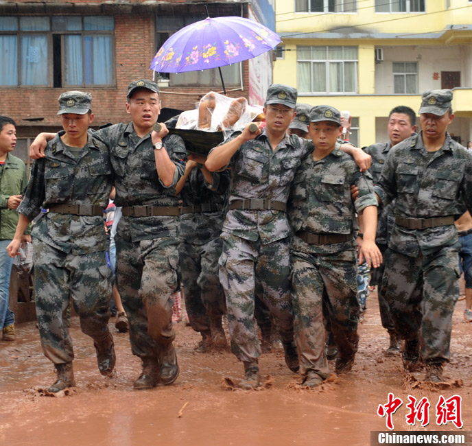 9月11日凌晨,云南彝良震灾区遭遇暴雨泥石流袭击,导致该县角奎镇发达村发生泥石流灾害,村民罗官珍家房屋倒塌被埋,家人将其救出后报警求助。由于伤者头、腰、腿受伤严重,不能乘坐汽车,成都军区驻滇某集团炮兵旅20余官兵冒雨急行军5个小时行30公里,采用肩扛步行方式将伤者安全送抵彝良县人民医院。目前,伤者正在医院救治。刘忠俊 摄