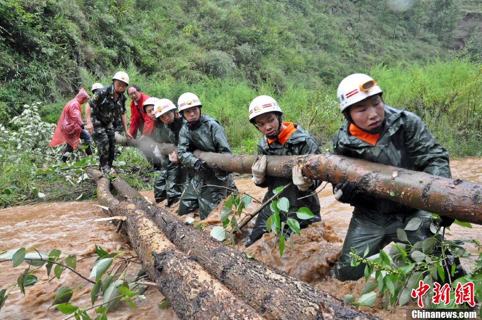 9月11日上午,受云贵地震影响的贵州威宁、赫章等县普降暴雨。位于毕节市赫章县财神镇中田坝村的一处地震受灾民众安置点因附近河流水位上涨,加上因地震导致的山体滑坡造成与外界交通阻断。正在当地抗震救灾的毕节消防支队抗震救灾突击队30名官兵闻讯后立即赶到事故现场。消防官兵利用附近树木架设临时通行的桥梁,以便帮助群众转移至安全区域。中新社发 邓捷 摄