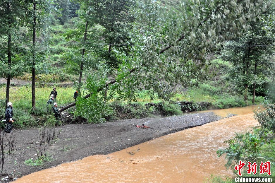 9月11日上午,受云贵地震影响的贵州威宁、赫章等县普降暴雨。位于毕节市赫章县财神镇中田坝村的一处地震受灾民众安置点因附近河流水位上涨,加上因地震导致的山体滑坡造成与外界交通阻断。正在当地抗震救灾的毕节消防支队抗震救灾突击队30名官兵闻讯后立即赶到事故现场。消防官兵利用附近树木架设临时通行的桥梁,以便帮助群众转移至安全区域。中新社发 邓捷 摄