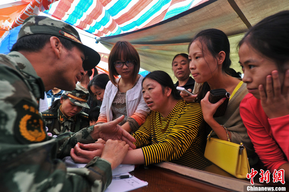9月13日,彝良震区震后医疗卫生工作有序开展,云南公安边防总队给予民众最大力度的医疗支持。图为官兵在安置点为受灾民众看病。中新社发 任东 摄