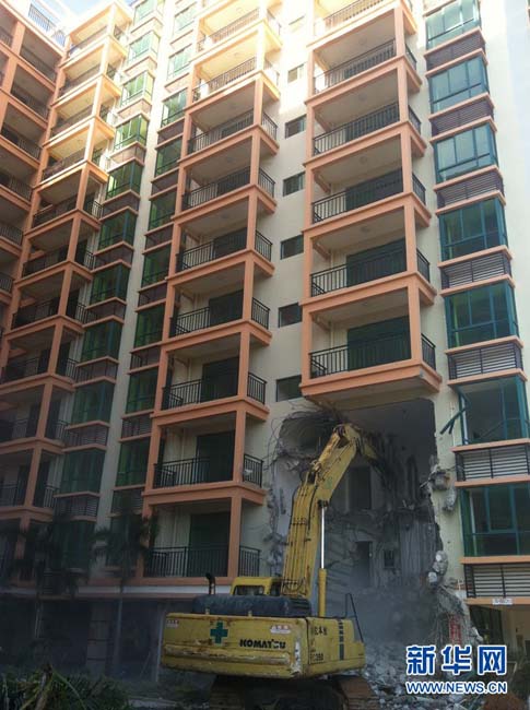 为防止发生拆除事故,三亚市综合行政执法局出动多台炮机和液压剪,多方位同时对违法建筑进行拆除,保证违建不会突然向一个方向倾倒。与此同时,包括消防、医疗、公安等多个部门有关工作人员也在现场待命,以防意外。据悉,此次拆迁共出动工作人员达500-600人。 图为拆除现场。图片来源:新华网