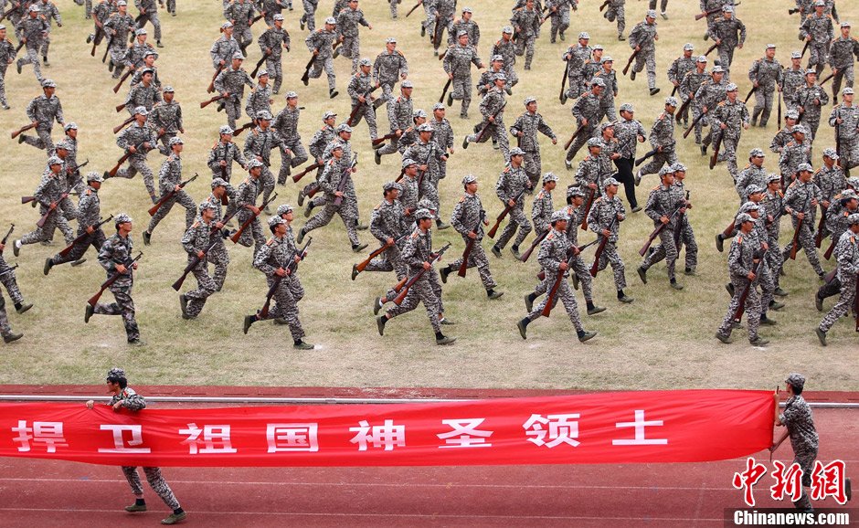 9月14日,大一新生在进行军训汇报表演时打出“捍卫祖国神圣领土”的横幅。当天,南京东南大学举行新生军训成果汇报大会,全校4000多名新生一身戎装接受检阅,以饱满的精神、昂扬的士气,展现出当代大学生的精神面貌。中新社发 泱波 摄