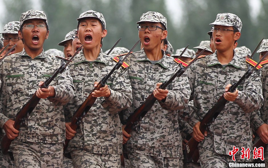 9月14日,大一新生在进行分列式军训汇报表演。当天,南京东南大学举行新生军训成果汇报大会,全校4000多名新生一身戎装接受检阅,以饱满的精神、昂扬的士气,展现出当代大学生的精神面貌。中新社发 泱波 摄
