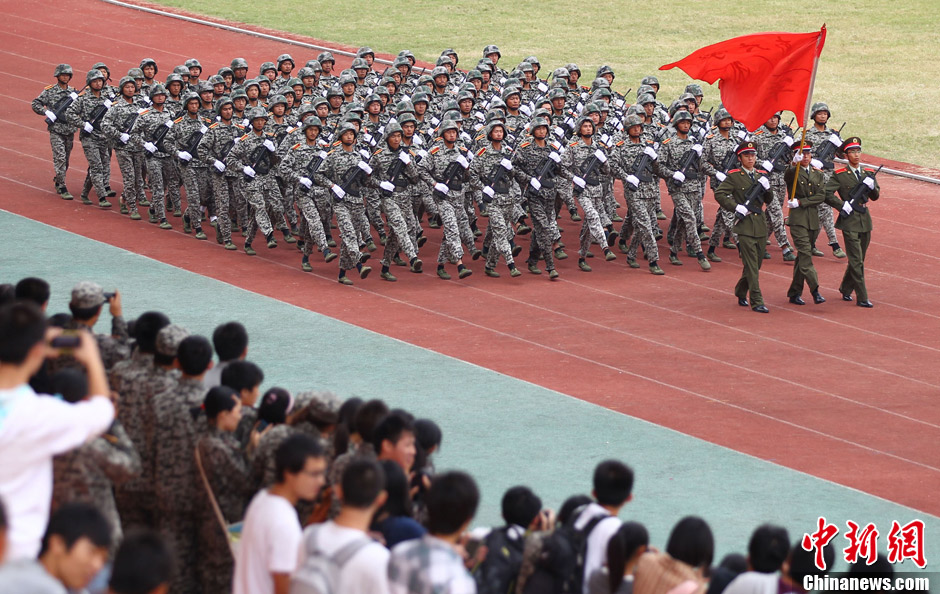 9月14日,大一新生在进行分列式汇报表演。当天,南京东南大学举行新生军训成果汇报大会,全校4000多名新生一身戎装接受检阅,以饱满的精神、昂扬的士气,展现出当代大学生的精神面貌。中新社发 泱波 摄