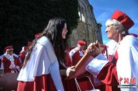 9月15日至16日,法国著名葡萄酒产区波尔多圣爱美浓镇迎来一年一度的葡萄采摘节,而中国著名影星赵薇以梦洛酒庄庄主身份跻身当地最古老红酒协会并受封该协会骑士勋章,为这极富法国文化特色的节日平添一抹东方亮色。中新社发 龙剑武 摄