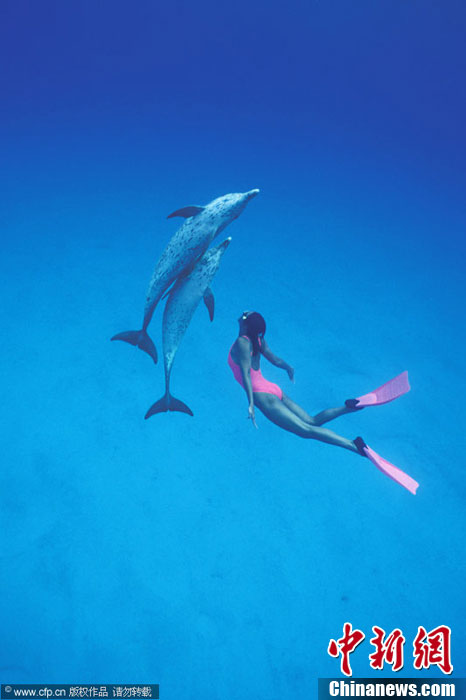 比基尼美女潜水员与海豚同舞 体验蓝色梦幻境界