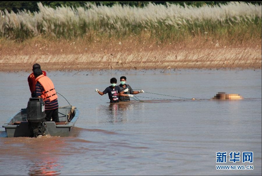 图为2011年10月11日下午,救援人员在泰国北部清莱府清盛县的湄公河水域打捞出第12具遇害船员尸体。尸体手部被绑。 杨定都 摄