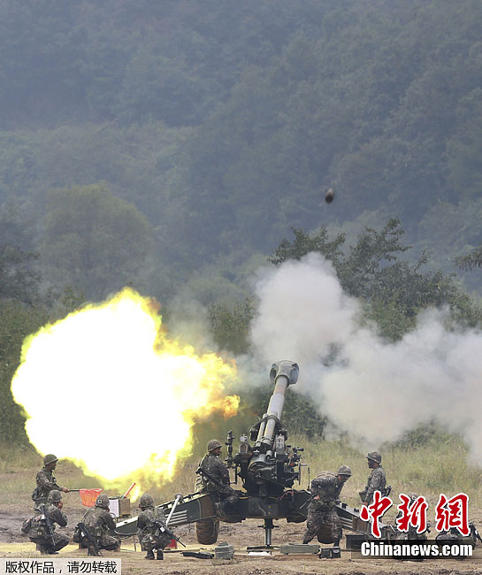 韩国陆军炮兵举行实弹射击训练