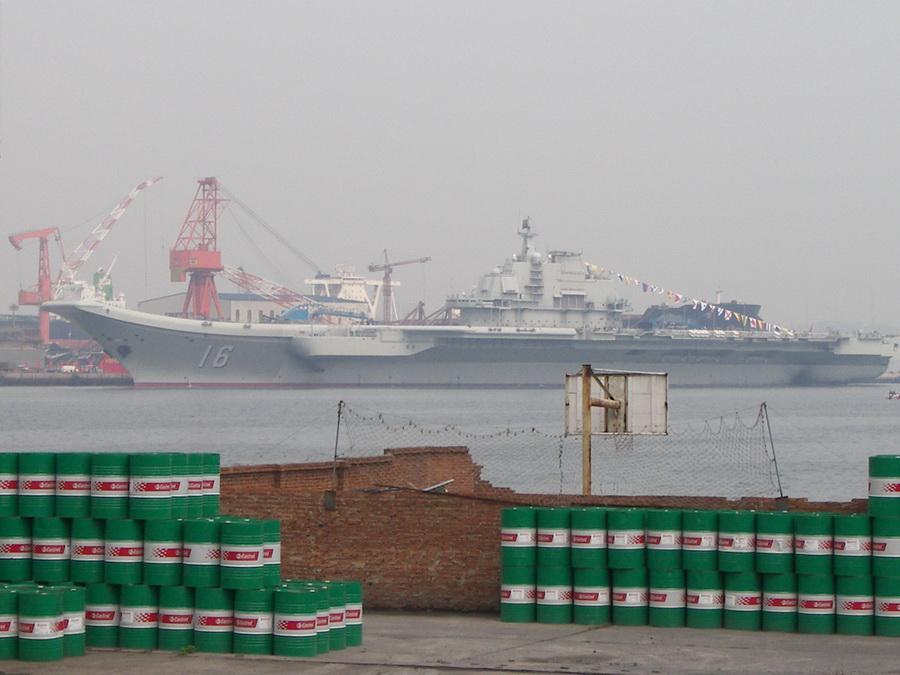 据消息人士透露,2012年9月23日下午16时许,中国第一艘航母平台16号舰在大连举行仪式,16号舰与相邻停泊的88号舰全部挂满旗。16点40分,16号舰舰桥桅杆升起五星红旗,舰首升起八一军旗,舰尾升起海军旗,17点20分,仪式完成。图为网友于23日在大连拍摄到的中国首个航母平台(超大军事 ppl 提供图片)图片来源:环球网