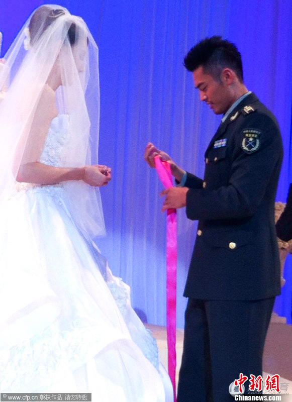 2012年9月23日,北京,林丹谢杏芳大婚,婚礼现场林丹着军装迎娶爱妻谢杏芳。图片来源:CFP视觉中国