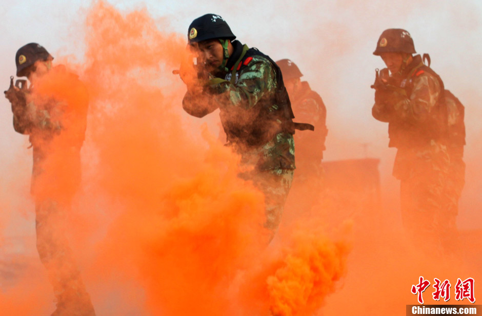 9月23日,辽宁公安边防总队鲅鱼圈边防检查站在港区码头举行了“2012平安之盾”口岸处置恐怖袭击事件联合演练活动,涉及口岸边检、公安、海事、海关、检疫等多家单位的200余名人员共同参演。以检验口岸单位联合反恐应急处突的能力和水平,为党的十八大营造安全和谐的口岸通关环境。图为9月23日,辽宁公安边防总队鲅鱼圈边防检查站官兵在进行持枪搜索。中新社发 蔡冰 摄