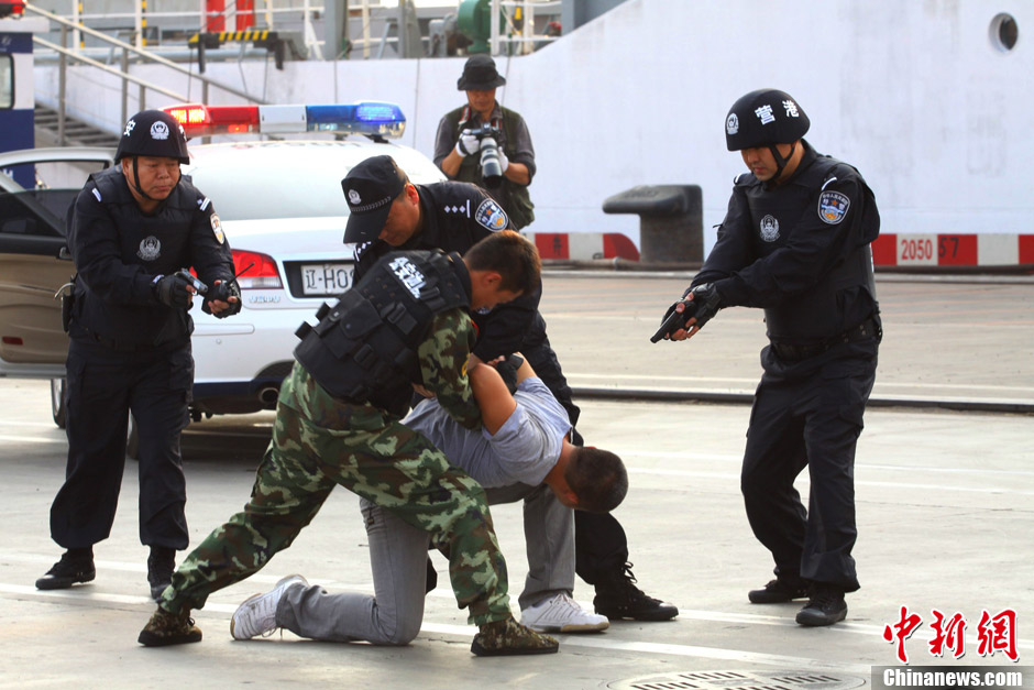 9月23日,辽宁公安边防总队鲅鱼圈边防检查站在港区码头举行了“2012平安之盾”口岸处置恐怖袭击事件联合演练活动,涉及口岸边检、公安、海事、海关、检疫等多家单位的200余名人员共同参演。以检验口岸单位联合反恐应急处突的能力和水平,为党的十八大营造安全和谐的口岸通关环境。图为9月23日,辽宁省鲅鱼圈港区边防官兵与公安民警联合处置解救人质。中新社发 蔡冰 摄