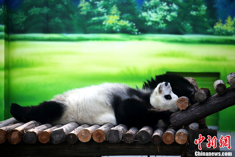 2012年9月24日,江苏苏州太湖国家湿地公园里,10岁的大熊猫“新月”在熊猫馆自己的“总统套房”里非常活泼,或者在倚靠小憩,或抱头仰卧,或伸舌玩耍吐出来“卖萌”,憨态可掬样子 ,让人忍俊不禁。李俊锋 摄 图片来源:东方IC 版权作品 请勿转载