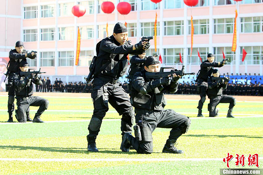 9月24日,吉林省公安系统首届警察体育运动会在长春市开幕,吉林省九市州、长白山管委会和行业公安局组成16支代表、670名选手参赛,在综合比武竞赛、田径、达标共三大类20个项目中展开激烈角逐。在当天的开幕式上,武警、特警以及警校学员还进行了枪操、格斗、战术动作等精彩表演。图为特警表演双人配合战术动作。张瑶 摄