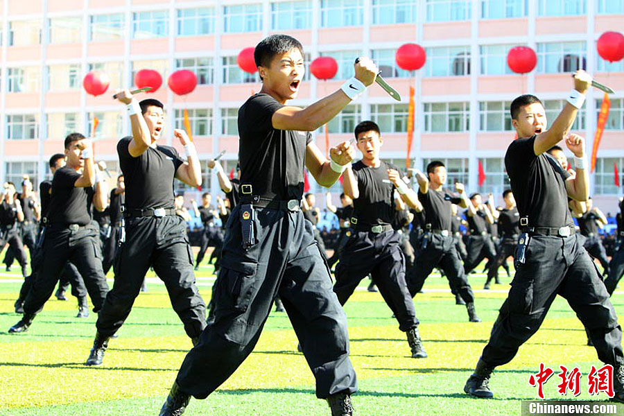 9月24日,吉林省公安系统首届警察体育运动会在长春市开幕,吉林省九市州、长白山管委会和行业公安局组成16支代表、670名选手参赛,在综合比武竞赛、田径、达标共三大类20个项目中展开激烈角逐。在当天的开幕式上,武警、特警以及警校学员还进行了枪操、格斗、战术动作等精彩表演。图为警校学员表演匕首操。张瑶 摄