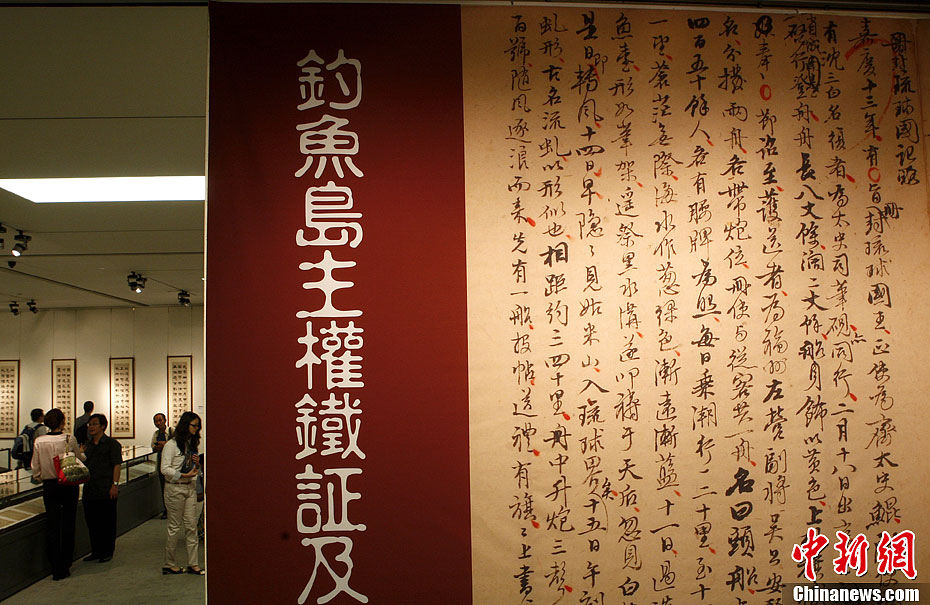 9月24日,北京保利艺术博物馆举办了钓鱼岛主权铁证以及国宝大展,图为门口处展示了放大版的清嘉庆年间墨迹本《记事珠》。中新社发 张浩 摄