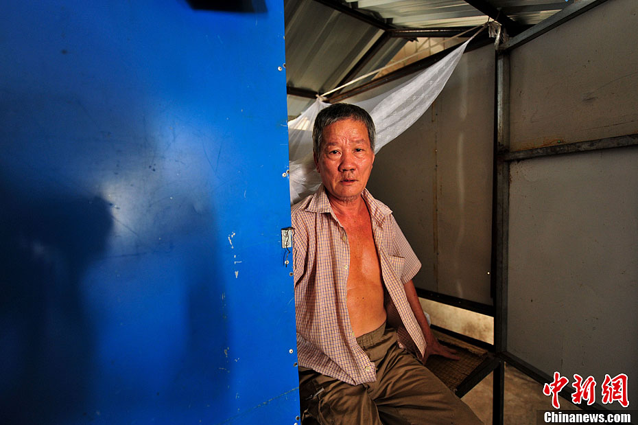 9月24日,海口市美兰区退休老人周亚二,自制一辆可移动的“铁皮房车”蜗居多年。据了解,老人每月有1800元的退休金,却因为年龄较大,且无监护人,居民因怕老人出意外没人管,不愿租房给他住。在一名好心农民工的帮助之下,周亚二老人制作了一辆“铁皮房车”,下面装有车轮,由于空间太小,就只能支个床铺,车内放有一张席子、一个枕头、一个扇子和一张蚊帐。中新社发 骆云飞 摄