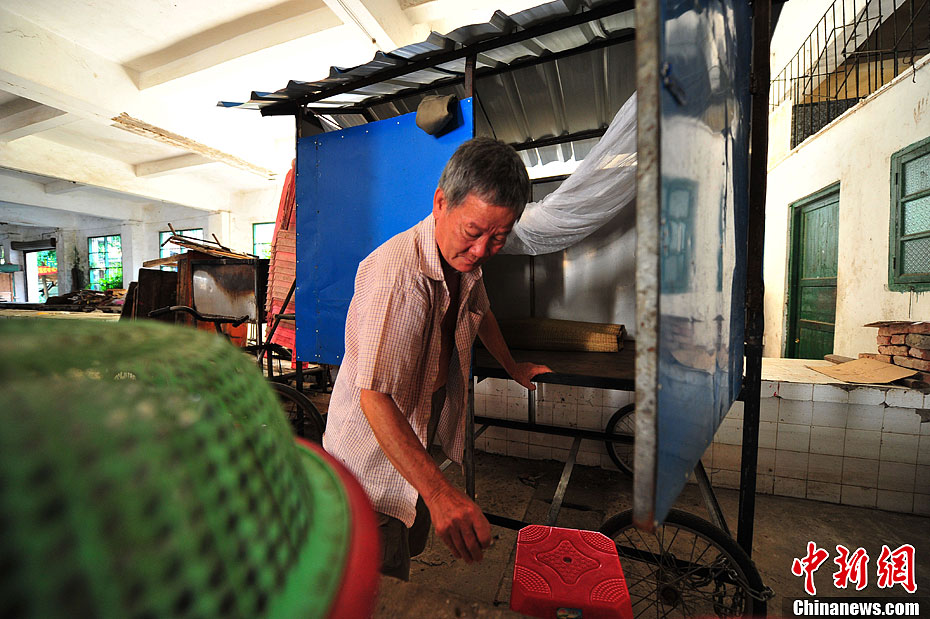 9月24日,海口市美兰区退休老人周亚二,自制一辆可移动的“铁皮房车”蜗居多年。据了解,老人每月有1800元的退休金,却因为年龄较大,且无监护人,居民因怕老人出意外没人管,不愿租房给他住。在一名好心农民工的帮助之下,周亚二老人制作了一辆“铁皮房车”,下面装有车轮,由于空间太小,就只能支个床铺,车内放有一张席子、一个枕头、一个扇子和一张蚊帐。中新社发 骆云飞 摄