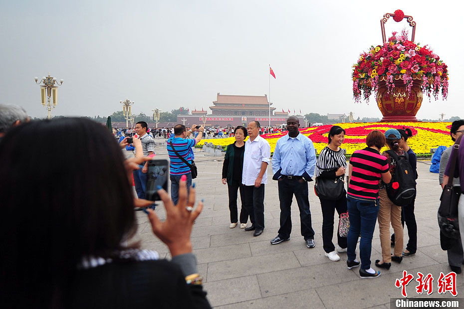 9月25日上午,为庆祝中华人民共和国成立63周年、迎接党的十八大,北京天安门广场中心以“祝福祖国”为主题、以花篮为主景的立体花坛正式亮相。广场中心花坛直径为50米,花篮最宽处11米,顶高15米。其中中心圆台底座高2米,花篮自身高13米,以红黄两色为主,是迄今为止天安门广场所布置过的最大花篮,吸引了海内外宾客前来参观合影留念。图为中外游客在花坛前合影留念。中新网记者 金硕 摄