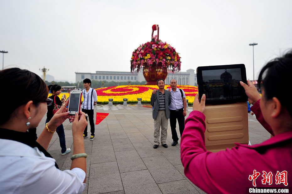9月25日上午,为庆祝中华人民共和国成立63周年、迎接党的十八大,北京天安门广场中心以“祝福祖国”为主题、以花篮为主景的立体花坛正式亮相。广场中心花坛直径为50米,花篮最宽处11米,顶高15米。其中中心圆台底座高2米,花篮自身高13米,以红黄两色为主,是迄今为止天安门广场所布置过的最大花篮,吸引了海内外宾客前来参观合影留念。图为中外游客在花坛前合影留念。中新网记者 金硕 摄