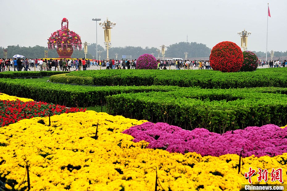9月25日上午,为庆祝中华人民共和国成立63周年、迎接党的十八大,北京天安门广场中心以“祝福祖国”为主题、以花篮为主景的立体花坛正式亮相。图为巨型花坛旁的花球。中新网记者 金硕 摄