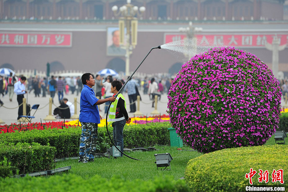 9月25日上午,为庆祝中华人民共和国成立63周年、迎接党的十八大,北京天安门广场中心以“祝福祖国”为主题、以花篮为主景的立体花坛正式亮相。图为园丁为花球浇水。中新网记者 金硕 摄