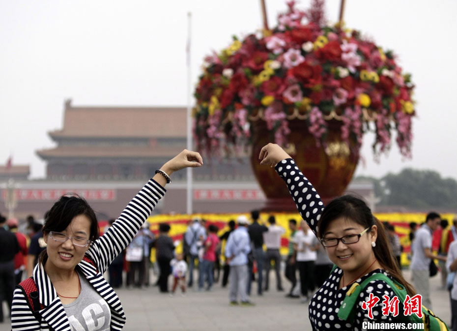 9月25日,两名游客与北京天安门广场上的巨型花篮合影,并摆出“手提花篮”的造型。为庆祝国庆63周年,大型花篮“祝福祖国”于近日完成吊装,亮相天安门广场。花篮净高13米,篮盘直径11米,是迄今为止天安门广场所布置过的最大花篮。中新社发 李慧思 摄
